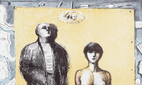 En esta litografía, Ernesto Banderas presenta una escena cargada de tensión silenciosa: un hombre de pie junto a una mujer desnuda en el centro de un salón vacío, enmarcados por un fondo amarillo que recuerda a una tela o una pintura colgada. Ambos personajes están quietos, observan hacia afuera, pero sin conexión entre ellos, como figuras atrapadas en una composición teatral o en una coreografía detenida. La obra juega con los contrastes entre lo masculino y lo femenino, lo vestido y lo expuesto, lo activo y lo contemplativo. El piso ajedrezado y el fondo enmarca el momento con una sensación de escena cuidadosamente construida, aludiendo al universo interior del artista y su reflexión sobre la figura humana y su representación.